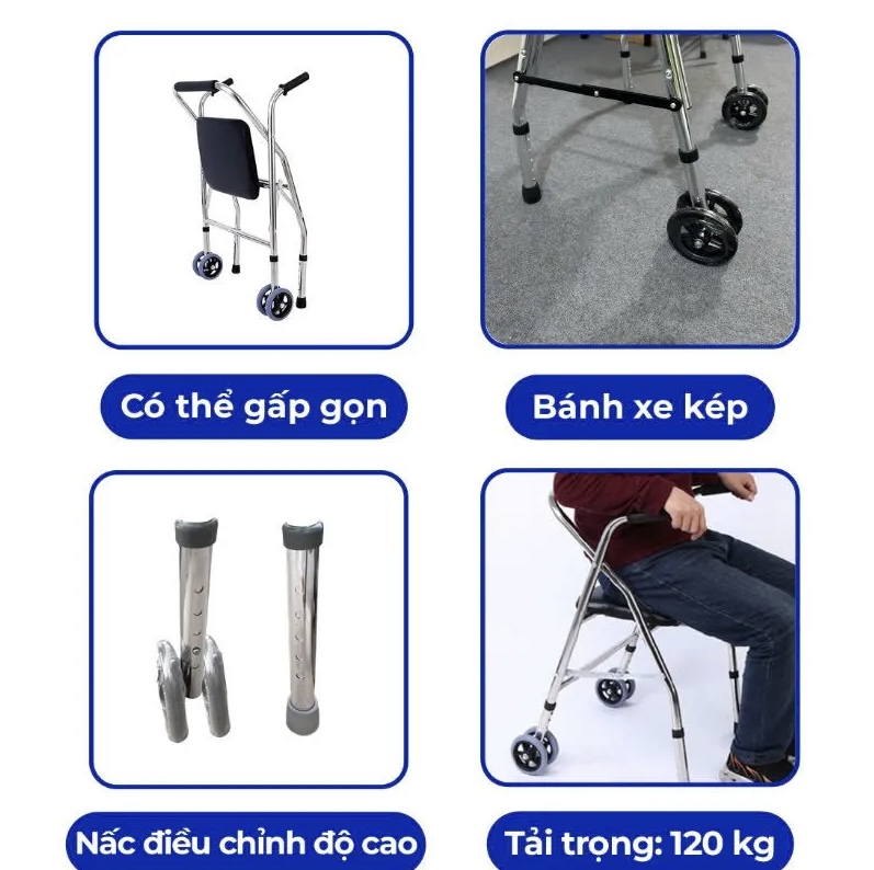 • Thiết kế 2 trong 1: Vừa là khung hỗ trợ đi lại, vừa có ghế ngồi đệm mút êm ái, giúp người dùng có thể nghỉ ngơi ngay lập tức khi mỏi chân.