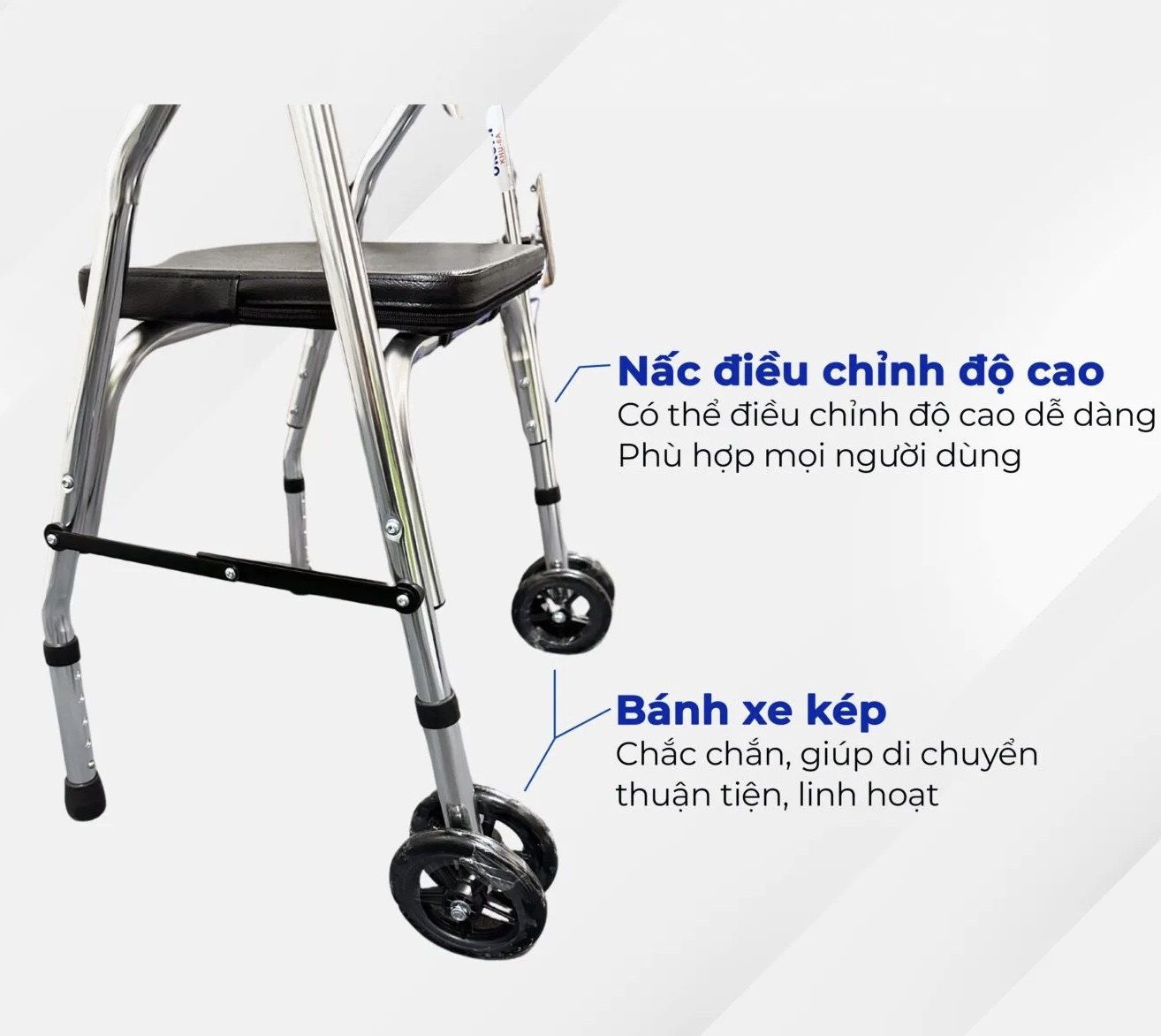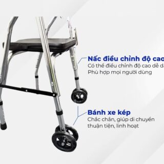 • Di chuyển linh hoạt: Trang bị 2 bánh xe kép phía trước giúp việc đẩy khung nhẹ nhàng, không tốn sức. 2 chân sau bọc cao su chống trượt tuyệt đối.